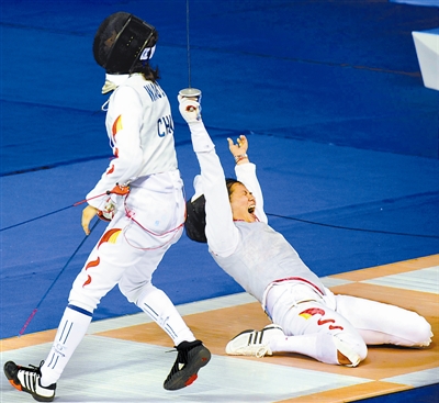 9月1日下午,在女子花剑个人比赛中,福建队的乐慧林(右)艰难地战胜上海的王晨后,高声呐喊庆祝胜利。