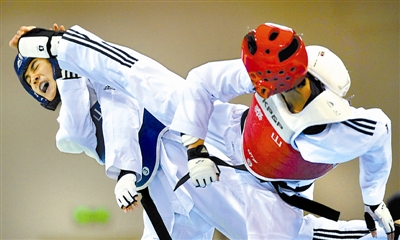 9月2日上午,在第十二届全运会跆拳道女子57公斤以下级比赛中,来自新疆生产建设兵团体协选手胡尔西旦·托合提(左)艰难地战胜重庆选手周美玲,进入下一轮。