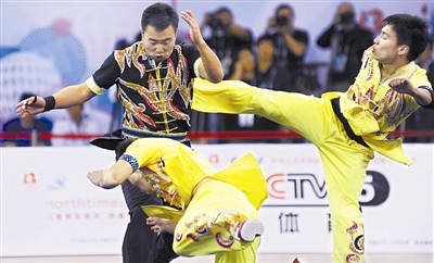 9月3日上午,第十二届全运会武术男子三人徒手对练惊险刺激,深受观众的喜爱,不时引发阵阵掌声,武术的魅力尽显无遗。图为江苏队选手在比赛中。本报记者 许之丰 摄