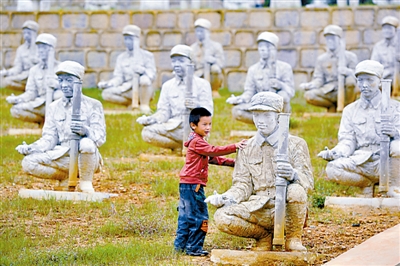 9月3日,正值世界反法西斯战争胜利68周年之日,中国远征军雕塑群在云南龙陵县松山战役旧址落成。据了解,由雕塑家李春华创作并捐赠的402座单体雕塑是用东方造像方式,按1:1.2的真人比例塑造。任东 摄