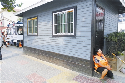 这座灰色的小木屋环卫道班房建在人行道上,盲道被压了一半,面积约15平方米,花费在四五万元,建成有一个多月了。常在此处摆摊的一名张姓师傅说,出入小木屋的是负责这一带环境卫生的管理者,他觉得小木屋不该占盲道。而住在附近的赵师傅说:“一线保洁员上班一身汗、回家满身灰,休息坐路边、吃饭在露天,那么漂亮的小木屋,应该供这些一线保洁员使用。”魏永贤/CFP