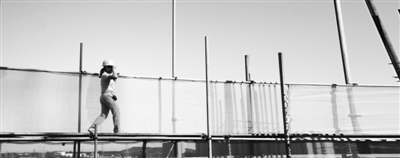 在脚手架上行走的女建筑工