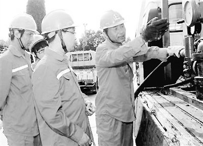 “有了这台创新升级版的标产车,咱们的标产工作破纪录啦!”河南油田采油一厂双河油矿437区块集输优化工作完成后,该区块的235口油井要进行标定产量。但仅靠现有的标产车一天最多只能干3口井。9月3日,该矿维修班创新工作室的技师韩永平率领着青工们进行创新,在现有简易标产装置上进行升级改造,加装上流量计和模拟回压装置,很快改装了一台新标产车,一天能标定15口油井产量,效率提高了5倍!图为韩永平(右)正为大家讲解升级版标产车的妙用。 单旭泽 摄