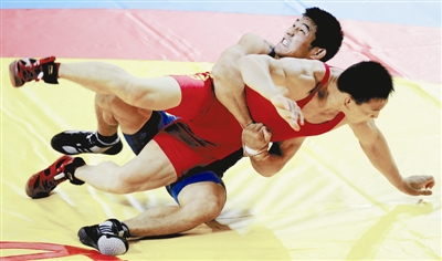 9月6日,在第十二届全运会男子摔跤74公斤级比赛中,山东选手洪兴(后)艰难地战胜对手。本报记者 许之丰 摄
