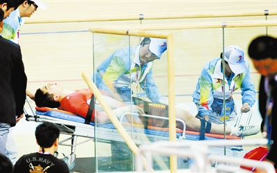 9月6日上午,在自行车男子凯林赛资格赛第4组的比赛中,山西队贾伟伟摔倒受伤,被送往医院就医。