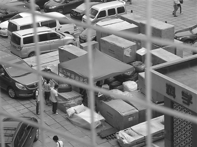 从一所在京高校的学生宿舍向下俯瞰,可以看到空地上停满了运送新生行李的车辆,几名新生正在购置售价为450元一套的被褥。本报记者 赵昂摄