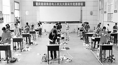 日前,重庆能源集团电工状元技能大赛在永荣矿业公司举行,来自该集团公司10个单位的28名电工参加决赛。参赛的电工都是各单位选拔赛的状元。考试分理论和实际操作两个部分,获得状元赛决赛前3名的选手由集团公司颁发技能证书并给予奖励。原野 摄