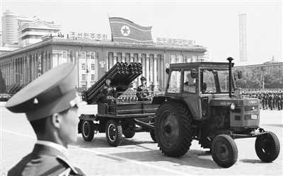图为工农赤卫队装备的拖拉机牵引型火箭炮亮相阅兵式。谢涛 供图