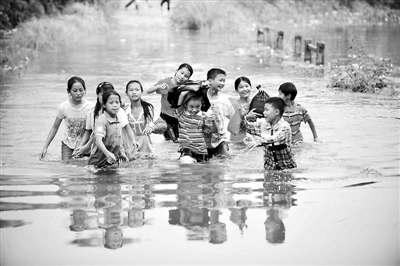 广西藤县古龙镇陈平村那龙组在陈平村小学就读的10多名五、六年级学生仍需涉水求学。孩子们告诉记者,每年雨季水库涨水,上学必经之路的大桥就被水淹没,一年最长有2、3个月,他们每天都要在水里往返,穿着湿衣服去学校上课,靠体温把衣服慢慢暖干。