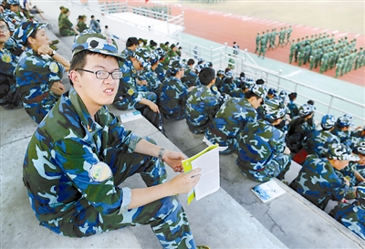 9月10日,杭州中国计量学院体育场上,大一新生正在进行紧张的军训。而看台上却坐着90多位“看客”,因为身体及其他原因成为了军训的“局外人”。东方IC供图
