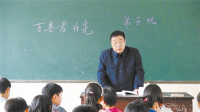 75岁高龄的谢臻嵩正在为农民工子女教授语文课。