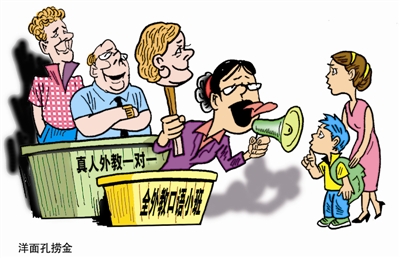 从选择双语幼儿园,到中小学课外英语培训,再到大学期间报读各类英语辅导班,出国前攻读托福、雅思、GRE等,英语培训的市场以最快的速度形成了产业链,其中外教成为一些机构吸引生源的重要筹码。但是,相比学历教育,培训市场上的“李鬼”更肆无忌惮,“金发碧眼”与高水平的外教并不能画上等号——