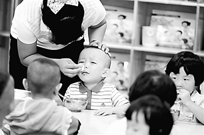 老师给孩子擦鼻涕 。