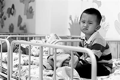 小男孩儿惆怅地望着镜头 。