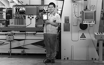 2013年8月9日10时,一汽解放公司卡车厂车架车间,白银存操控着ABB手柄,对机器人进行着手动编程。白银存生于1991年,长春汽车工业高等专科学校数控技术专业毕业,在车架车间工作三年。