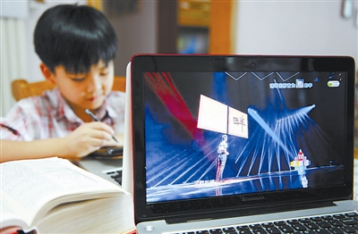 一位小学生正在通过电脑、智能手机以及字典参与《汉字英雄》的节目互动。CFP供图