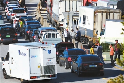 9月16日,韩方车辆陆续通过位于韩国京畿道坡州的南北出入境事务所,前往开城工业园区。新华社发(朴真熙 摄)
