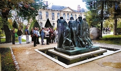 9月15日,在法国巴黎,参观者在罗丹博物馆前广场观赏雕塑。
