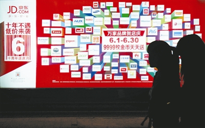 6月3日,在郑州街头的京东10周年促销广告中,入驻京东商城平台的众多品牌纷纷亮相参加促销。沙浪/CFP
