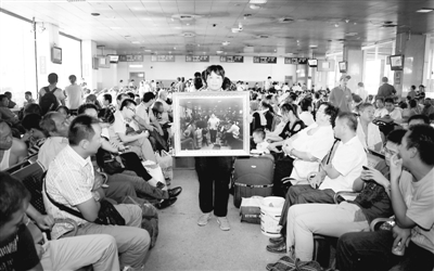 9月11日,江苏省常州市,火车站保洁员程桂云在与自己的工作照合影。