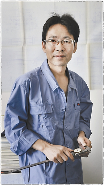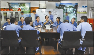 九月二日 , 胡耀华在他的 “ 大师工作室 ” 里向前来求教的工友作港口机械核心部件的工艺改革设计说明 。