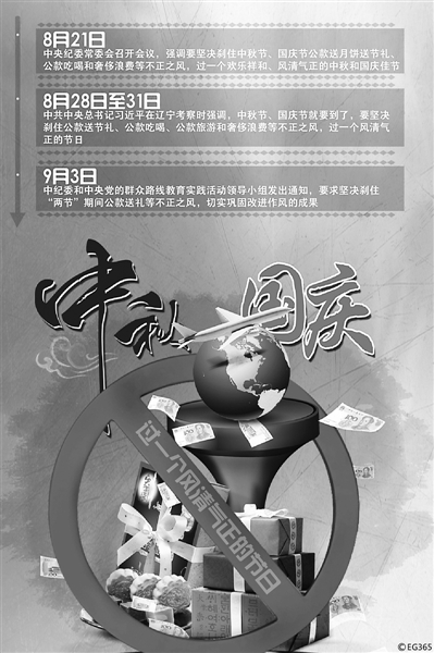 9月3日,中央纪委和中央党的群众路线教育实践活动领导小组专门下发通知:节日期间,严禁用公款送月饼送节礼;严禁用公款大吃大喝或安排与公务无关的宴请;严禁用公款安排旅游、健身和高消费娱乐活动;严禁以各种名义突击花钱和滥发津贴、补贴、奖金、实物。