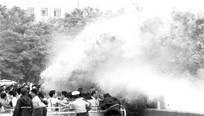 9月21日,在杭州下沙钱塘江沿岸,观潮者在躲避来势汹汹的钱江潮水。
