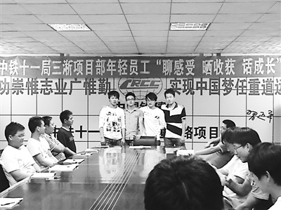 在中铁十一局四公司三淅项目部举办的“聊感受,晒收获,话成长”座谈会上,劳务派遣工张健(左一)应邀走上主席台,和测量队队长马明亮(左二)、测量员黄正江(右一)一起,“牵手实习生一起走”。
