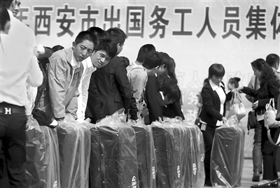 9月24日,西安市户县,180名年轻的农民工拿到刚发的行李箱很开心,他们即将赴日本、德国、新加坡、阿尔及利亚等国务工,主要在工厂、农场从事缝纫、农业种植、厨师等工种。截至目前,西安市累计外派劳务2.3万人次,直接劳务收入20多亿元。袁琛 摄/CFP