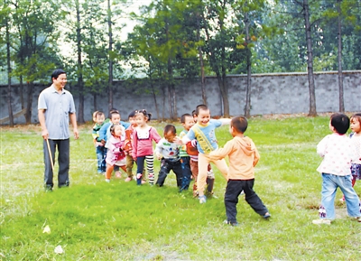 9月23日,星火小学56岁的李书海老师正在和学生一起做老鹰抓小鸡的游戏。“爷爷奶奶教小学,叔叔阿姨教初中”,这是眼下湖北安陆市众多农村学校的真实写照。这些地方大部分教师皆由民办教师转正而成,如今多数年过半百。这里的学校吸引不了年轻教师,即使招来了教师留不住。农村教育如何健康发展是摆在这些地方面前的一道难题。王代金 摄