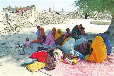 9月25日,在巴基斯坦俾路支省阿瓦兰地区,村民们坐在倒塌房屋废墟旁的树下。