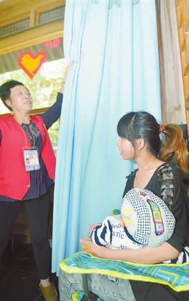 “微笑亭”是设立在西湖景区内,由志愿者驻守的固定旅游服务点。在曲院风荷景区的“微笑亭”,志愿者顾阿姨介绍,以前就有游客来询问哪里可以给孩子喂奶,志愿者只能请母子进到“微笑亭”里,关上门,背对着窗户来喂。“哺乳点”的设立,有效解决了露天哺乳的尴尬。徐彦 摄/CFP