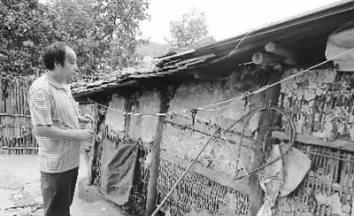 记者在老人两个女儿都提到的老屋前看到,房屋外表藤条裸露,不大的房子四处都用编织袋打着补丁,透过缝隙可看到屋内各种器具已是锈迹斑斑,而隔壁便是邻居家的鸡棚,浓郁的牲畜粪便味让人无法呼吸。就在这摇摇欲坠的破屋之外,记者巧偶遇骑三轮车从镇上赶来的大儿子贾元彬。