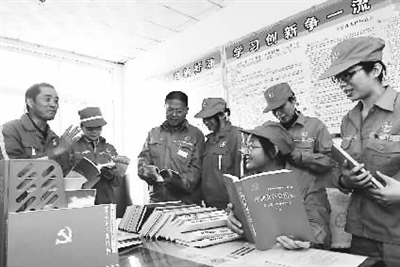 在党的群众路线教育实践活动中,中原油田采油三厂党委以“红色旗帜、时代风采”为主题,在全厂员工中开展“品读红色经典”读书活动。该活动以“红色经典”、“红色记忆”、“红色一课”、“红色剪纸”等为载体,引导员工爱油田、爱岗位,以实际行动为油田开发建设做出成绩。图为该厂油气集输大队员工利用工作间隙,品读《红日》、《青春之歌》等红色书籍,丰富业余文化生活。 赵奕松 摄