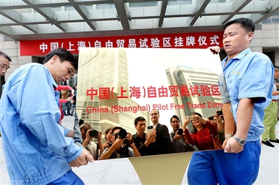9月29日,上海,两名工人在挂“中国(上海)自由贸易试验区”标牌。中国(上海)自由贸易试验区当天正式启航。首批入驻自贸试验区的企业和金融机构代表获颁证照。赖鑫琳 摄
