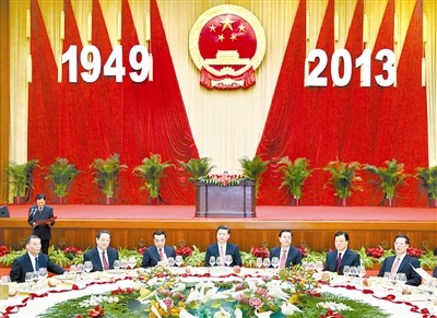 9月30日,国务院在人民大会堂举行盛大招待会,热烈庆祝中华人民共和国成立64周年。习近平、李克强、张德江、俞正声、刘云山、王岐山、张高丽等党和国家领导人与中外人士欢聚一堂,共庆共和国华诞。 新华社记者 鞠鹏 摄