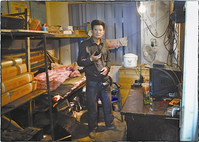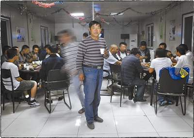 刚刚在工地食堂参加了中秋聚餐后回到住处。 老家已有两个儿子和3个孙子。先后在外打工13年,中秋节和国庆节均在外地度过。为能保证及时发放材料,他把住处常年设在了材料库。