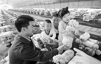 银耳、长根菇、竹荪等几十种珍稀菌菇使今年“十一”黄金假期市民餐桌更加丰富。北京市通州区永乐店食用菌产业园年产新鲜蘑菇可达3000多吨,占北京鲜菇市场约30%份额。图为市民家庭在大棚里采摘蘑菇。
