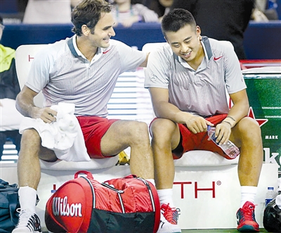 当日,在上海网球大师赛男子双打首轮比赛中,瑞士选手费德勒与中国选手张择以2比0战胜南非选手安德森和俄罗斯选手图萨诺夫,晋级下一轮。 新华社记者 凡军 摄