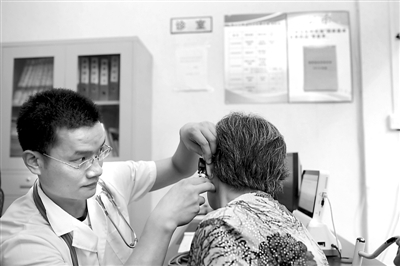 福建省福安市下白石镇英平村卫生所医生阮作斌用便携式全科医生工作站的诊断仪为老人们做检测(10月8日摄)。