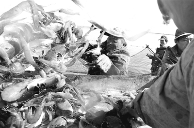 10月11日,在河北曹妃甸一海水养殖场,渔民正在收捕养殖的对虾和河豚,面对今年的丰产丰收,渔民的喜悦溢于言表。近年来,曹妃甸区不断开辟海水养殖新路,促进水产养殖向高层次发展。 本报记者 杨登峰 摄