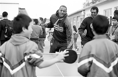 10月14日,台京学校的学生与金州勇士队球员伊戈达拉(中)打乒乓球。当日,该队队员和多位传奇球星将“NBA关怀行动”带进北京市石景山区台京学校。 新华社记者 白雪飞 摄