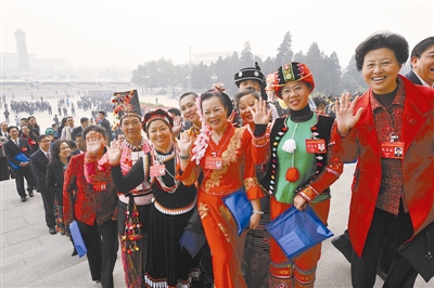 10月18日,少数民族代表盛装出席中国工会第十六次全国代表大会。 本报记者 张宪 摄