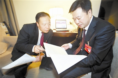 10月19日晚上,在河南团驻地,来自企业的冷潜(右)和李科两位代表一起讨论中国工会十六大报告中有关企业的论述。他们表示,在实现中国梦的过程中,国有企业要担当起政治责任、经济责任和社会责任。回去后,他们不仅要在工会、全体职工中传达工会十六大精神,还要在党政班子中进行宣讲。本报记者 杨登峰 摄