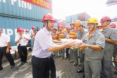 海南省人大常委会副主任、省总工会主席陈海波给一线职工送解暑慰问品
