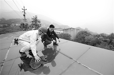 10月22日,田麒麟(右)和国家电网重庆北碚供电公司蔡家供电营业所的技术员许长江在太阳能电池板上进行巡检。