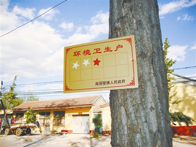 玉石厂外面的蓝天白云与里面幽暗的环境形成了鲜明对比,而厂门前树上挂着的“环境卫生户”的牌子则显得有些讽刺。