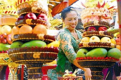 当地时间10月23日,印尼巴厘岛民众手捧鲜花水果祈祷,庆祝加隆安节。加隆安节又称地球节,是为了感谢神灵创造了地球以及世间万物。加隆安节是巴厘印度教最大的节日,为期10天。阿健 供图
