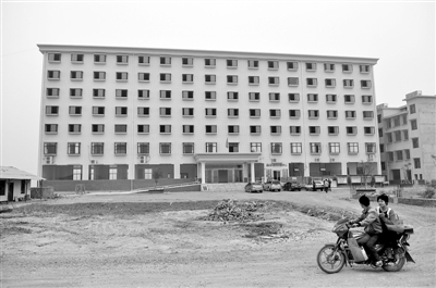 图为10月21日,村民骑摩托经过湖南长沙岳麓区莲花镇云盖村欠债千万元新建的豪华村部楼。