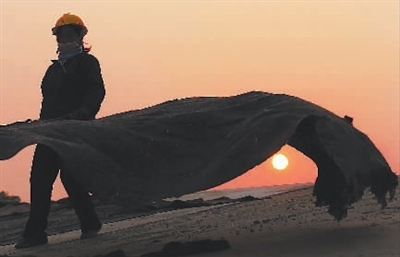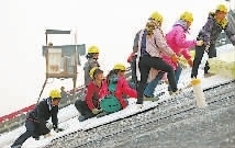 10月27日,女工们正在进行保温板铺设作业,这样的活不累,但要心细。